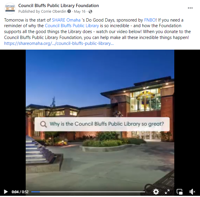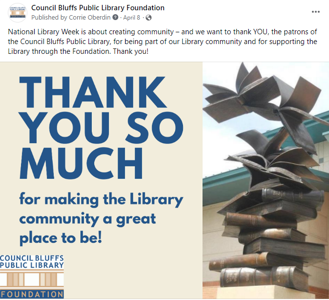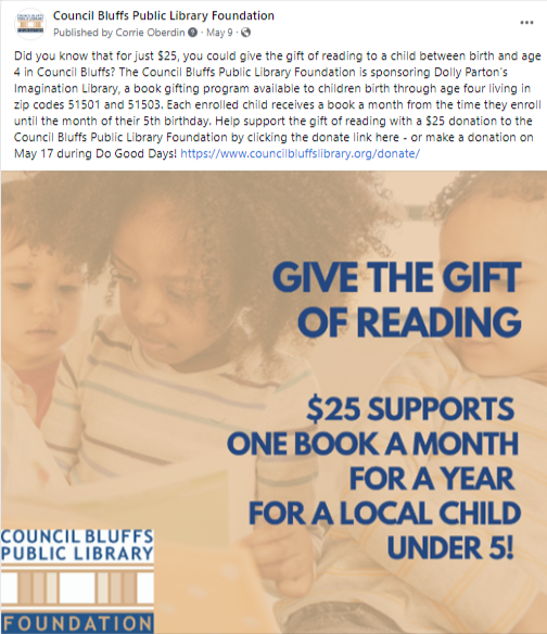 Library Week takes place in April, and the local annual giving event, Do Good Days, which takes place in May, are close to each other. We use this as an opportunity to tell the story of how the Foundation supports the Library during April and then leverage that storytelling in May to make requests for support. Our campaign includes social media messaging for Facebook & Instagram, emphasizing program impact, a one-topic email, and print postcards to donors.