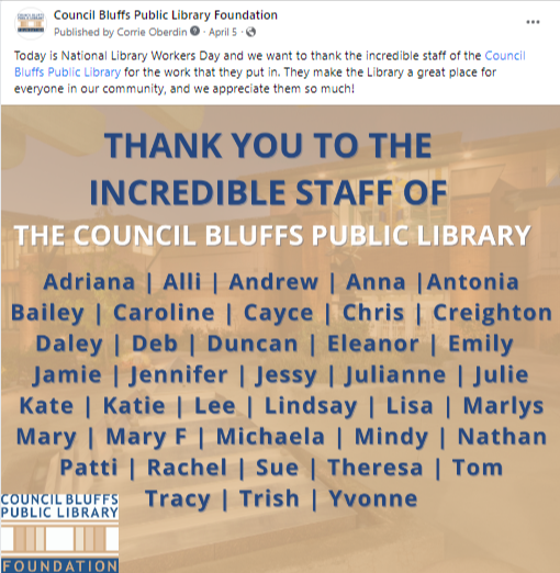 The Council Bluffs Public Library Foundation has hosted a Speaker Series since 2020. Launching during a pandemic was no easy task, and the series has expanded from one author to three each year. Held at a local art center (The Arts Center @ IWCC) to accommodate more patrons at the event, this series helps bring premiere authors to Council Bluffs like Geraldine Brooks, Mary Roach & Elin Hilderbrand. We provide combined support including email campaigns, social media posts, advertising & PR support, and hosting a Foundation table with promotional materials for the Foundation at the event.