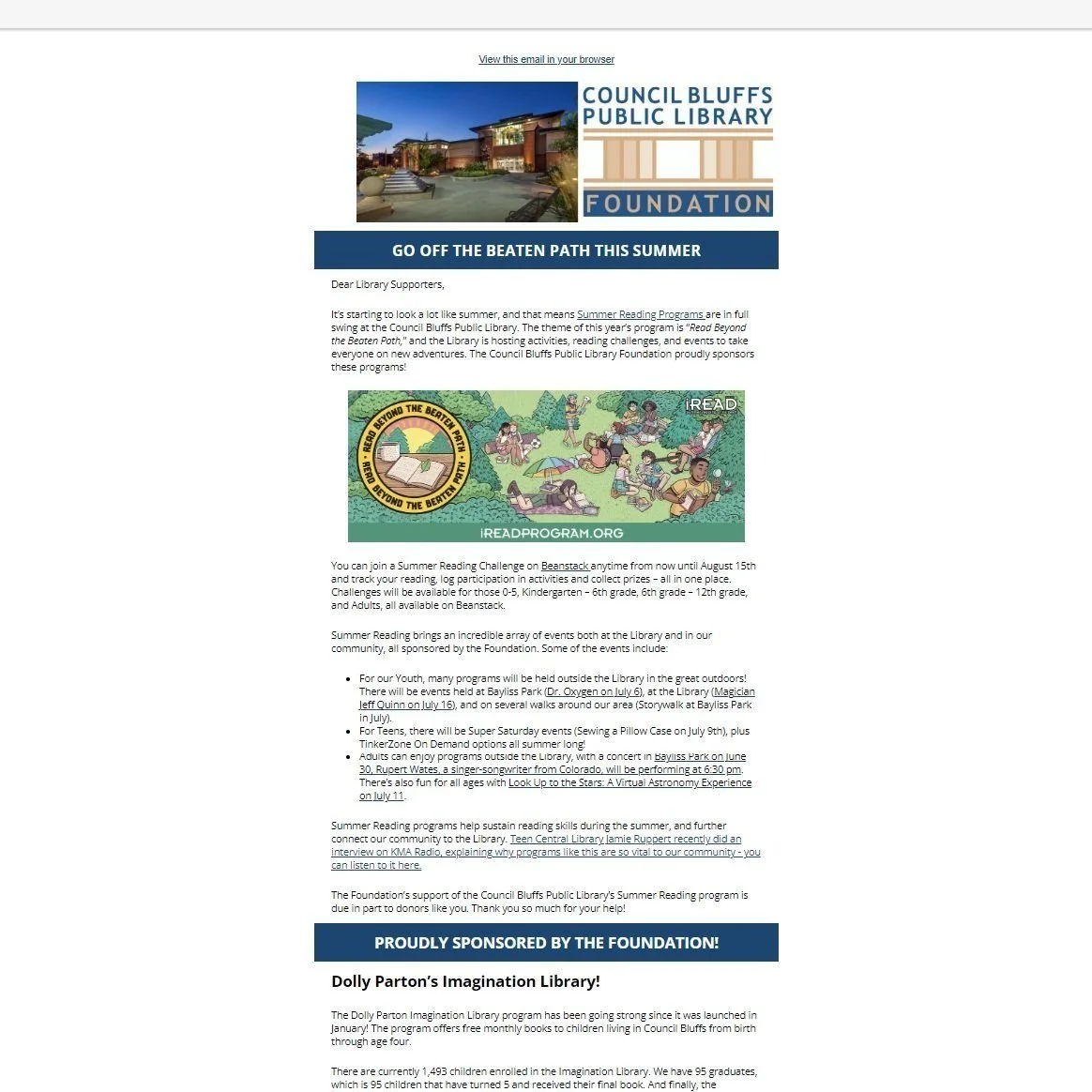 In 2019, we launched a quarterly newsletter for the Library Foundation, which has since grown to include several one-topic emails highlighting Foundation-sponsored programs. It is a way for the community to get a “first look” at new Foundation projects before they debut at the Library, hear how their dollars are helping the community, and support Library programs. Together with the Foundation & the Library, we determine the stories to tell, programs to highlight, and calls to action based on current needs.