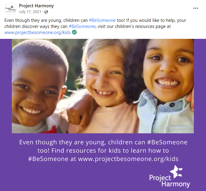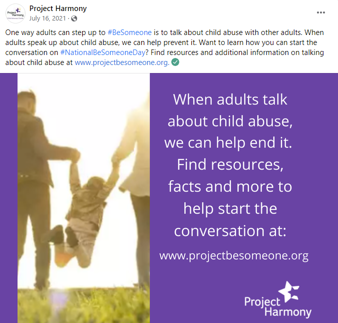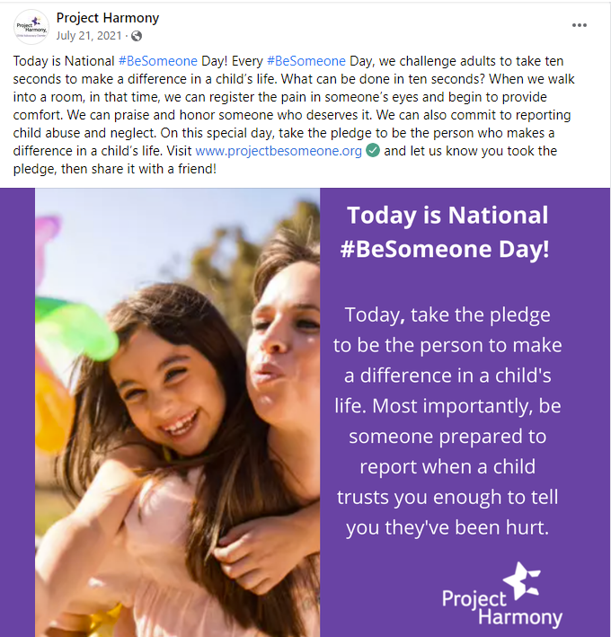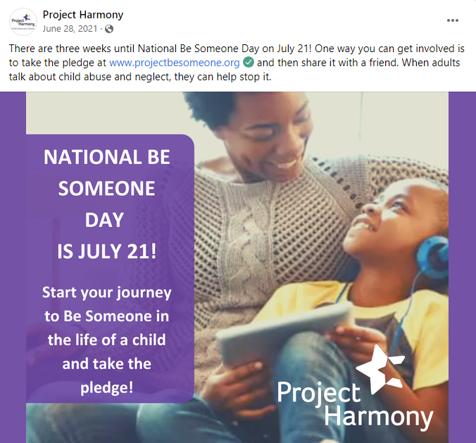 In 2017, Project Harmony created “Be Someone Day.” Held annually on July 21, Project Harmony challenges adults to take the pledge to Be Someone in a child’s life. This day focuses on educating adults about the signs of child abuse & neglect and giving them the tools to report abuse. The following are four posts from Be Someone Day 2021, which encouraged adults to take the pledge and drove donations for Project Harmony.
