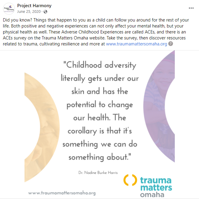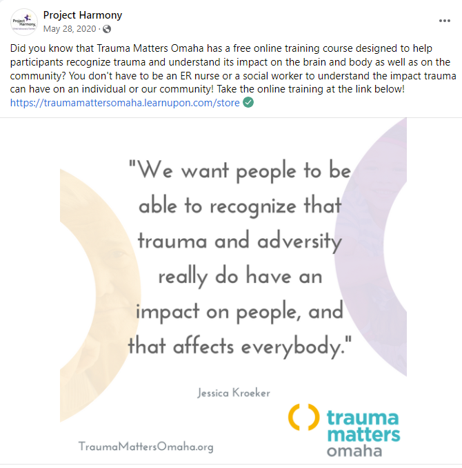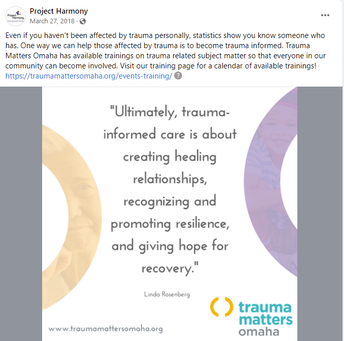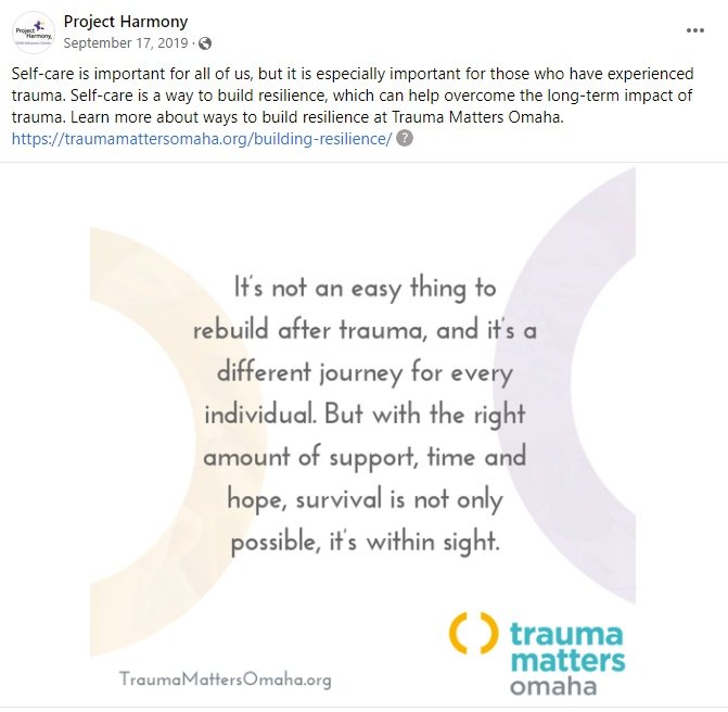 In 2018, Project Harmony launched “Trauma Matters Omaha,” a community-wide initiative that focused on training the Omaha community to recognize & respond to trauma. To support this initiative, we worked with Project Harmony to create ongoing messages to educate the community about trauma, encourage community-focused action and provide support for those experiencing trauma. Below are four sample messages that exemplify this approach.
