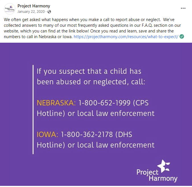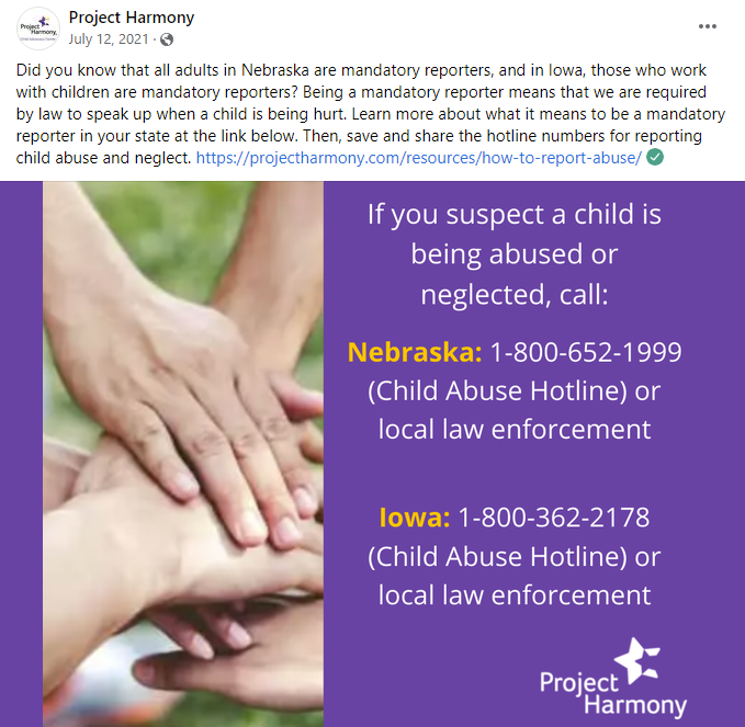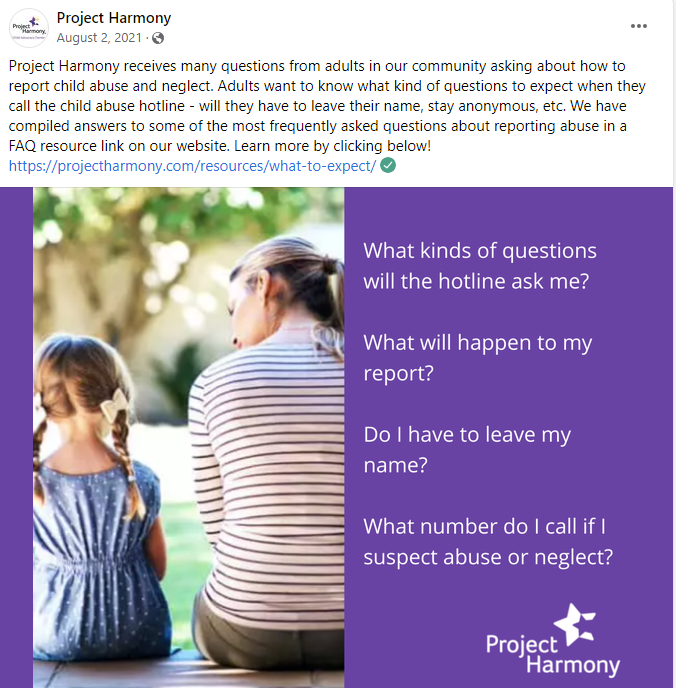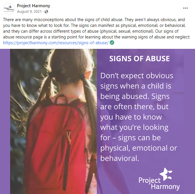 Project Harmony’s mission aims to end child abuse and neglect. Throughout their social media messages, they weave themes of educating adults on how to be aware of child abuse & neglect - and what to do when they suspect something. Below are four message samples we utilized in 2020 & 2021 to help educate adults.